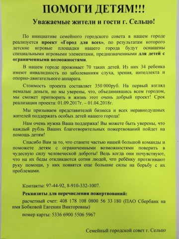 Всего за 3 часа было собрано 51576 рубля. Сумма передана председателю общешкольного родительского комитета БОБКОВОЙ Е.В. для дальнейшего перечисления на расчетный счет проекта «Город для всех»..