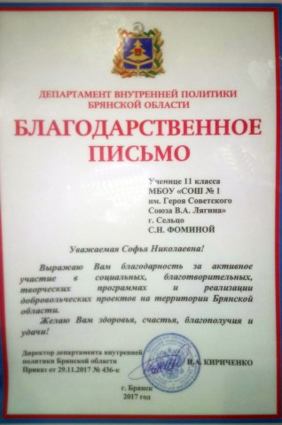 Среди отмеченных добровольцев были и учащиеся города Сельцо, добровольцы городского волонтерского отряда «Дорогой добра». Это ФОМИНА Софья (СОШ № 1), МАРКЕЛОВА Валерия (СОШ № 2) и ДРОГОБУЖСКАЯ Дарья (СОШ № 4). Им были вручены благодарственные письма департамента внутренней политики Брянской области.