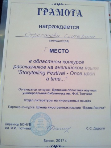 Победители и призеры были награждены грамотами и призами от Брянской областной библиотеки. Все участники конкурса получили сертификаты, предоставляющие право на бесплатное обучение в течение 1 месяца в школе иностранных языков “Брава Лингва”.