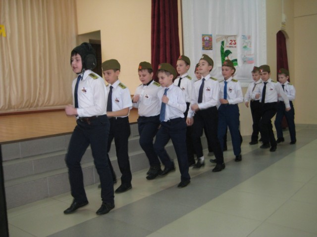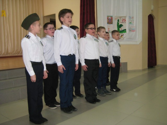 Выступления ребят оценивало мужское жюри: это папы, которые пришли посмотреть выступление команд. А девочки от каждого класса исполняли музыкальные номера-поздравления. Каждый класс оказался победителем в различных номинациях: лучшая экипировка отряда, за лучшее исполнение песни, за лучшую строевую подготовку, лучший командир… В завершении мероприятия все команды были награждены почетными грамотами.