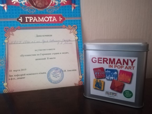 16 марта в Брянском государственном университете им. академика И.Г. Петровского преподаватели кафедры немецкого языка провели для учеников общеобразовательных учреждений Брянской области III образовательный страноведческий квест «Путешествие по Германии», в котором приняли участие наши ученики: Знаменская Алена и Моисеев Владислав - 11 класс, Кулешова Ирина - 10 класс (учитель Моисеева Т.В.)