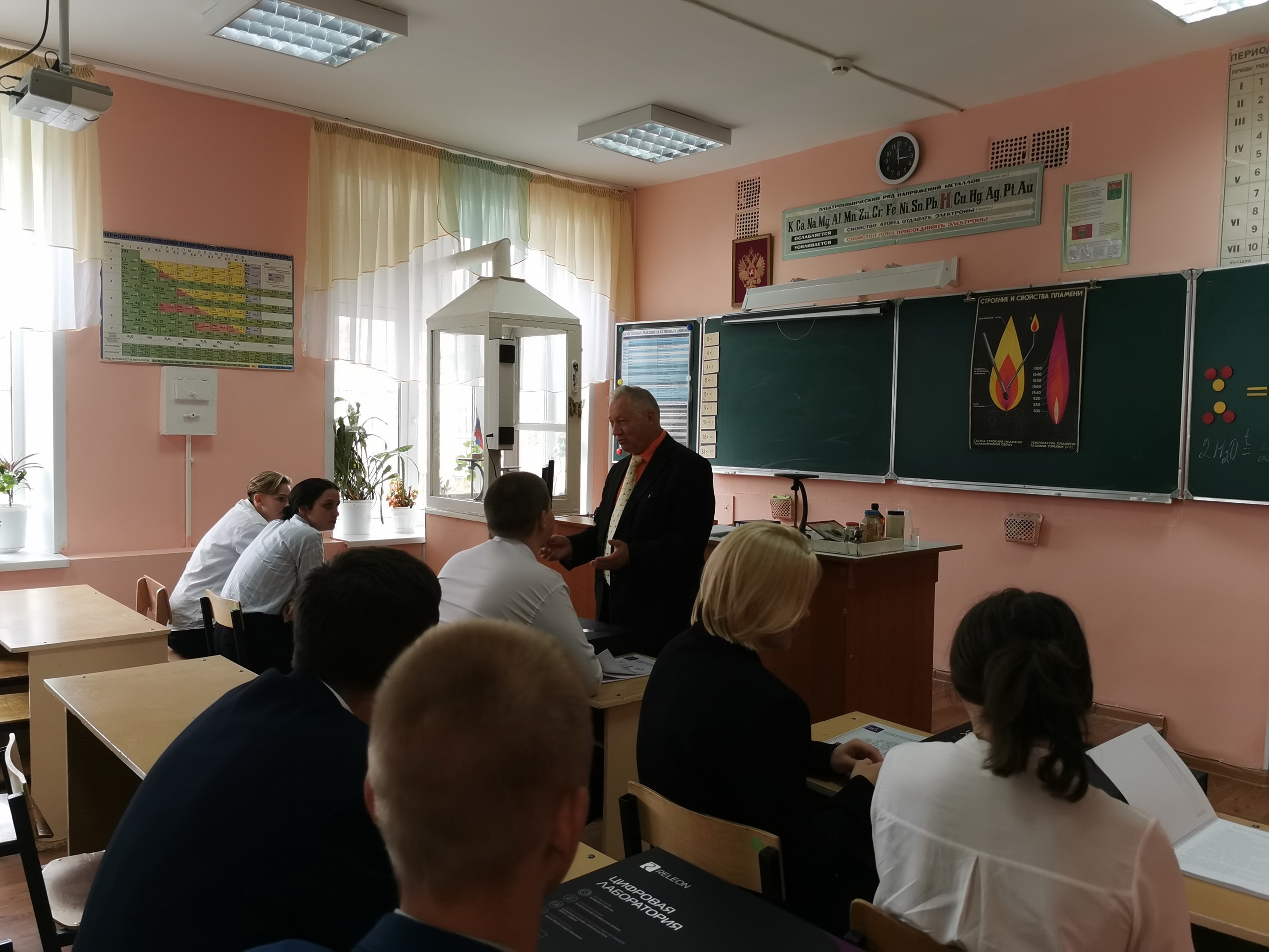 В кабинете, где будут проходить занятия, учащиеся и гости с удовольствием посмотрели опыты, которые продемонстрировал учитель химии А. И. Ерёменко, который сообщил присутствующим о возможностях нового школьного оборудования, заинтересовав дальнейшими перспективами занятий.