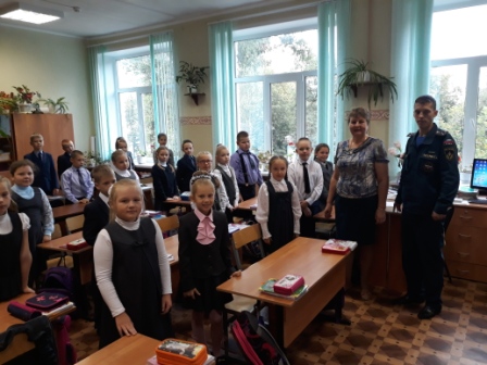- для учащихся 1-4 классов проведен Всероссийский открытый урок «Основы безопасности жизнедеятельности». Во 2А классе урок провел преподаватель-организатор ОБЖ Платонов Е.Ю., а в 3А классе – инспектор отдела надзорной деятельности и профилактической работы по Брянскому району капитан Пигарев Д.А.