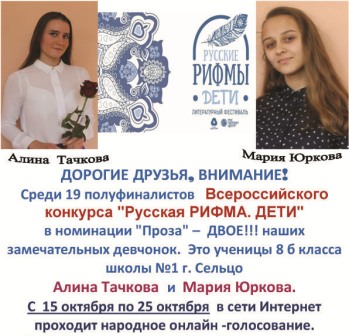 В августе 2017 года были объявлены 46 полуфиналистов конкурса, куда вошли учащиеся 8 класса ТАЧКОВА Алина и ЮРКОВА Мария.