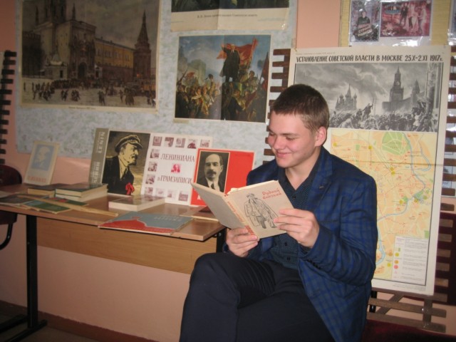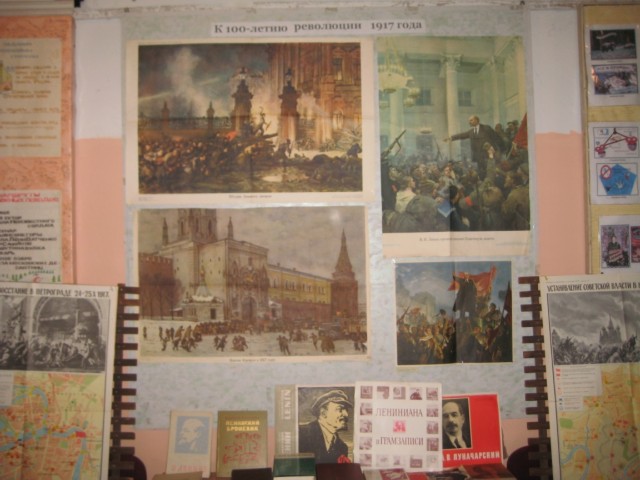 Более подробно о событиях Октябрьской революции можно было узнать из выставки «К 100-летию революции 1917 года», которая расположилась на 2 этаже: посмотреть репродукции и грампластинки, полистать книги, работы Ленина.